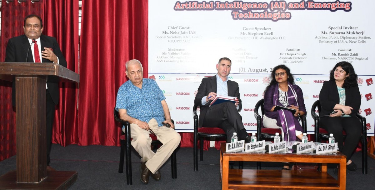 Lucknow Management Association in collaboration with ASSOCHAMUP-Uttarakhand, IDFC First Bank and NASSCOM organized Panel Discussion on “AI and Emerging Technologies” on 01 August 2025. Eminent panelists were Mr. Stephen Ezell, Vice President, Information Technology and Innovation Foundation (ITIF), Washington D.C., Mr. Pramod Dixit, Former Academic Director, PNBIIT, Dr. Deepak Singh, Associate Professor, Indian Institute of Information Technology (IIIT), Lucknow and Mr. Ramish Zaidi, Chairman, Regional Council, NASSCOM. Mr. Vaibhav Vaidya CEO & Managing Director SAV Consulting Inc, Canada. Ms. Neha Jain IAS Special Secretary IT&E, GoUP and Managing Director UPDESCO was Chief Guest of the session. Mr. A.K. Mathur Sr. Vice President of LMA welcomed & introduced the panelists.