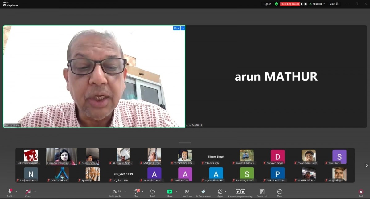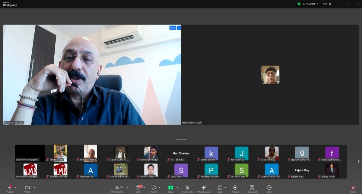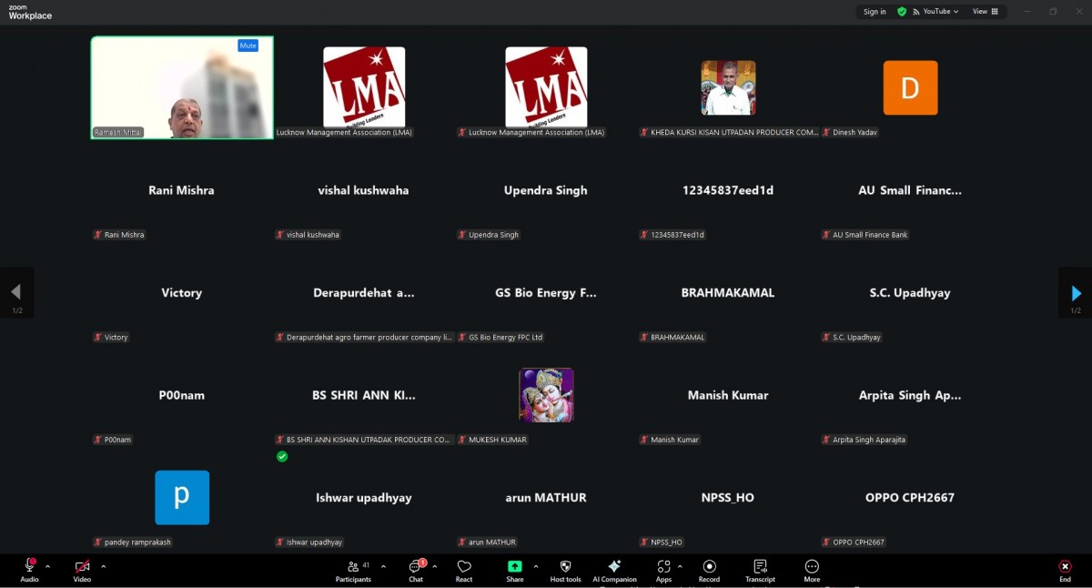 Lucknow Management Association organized an online workshop on “Resolving FPOs different problems” on 27 August 2025. Speaker was Dr. Ramesh Mittal Ex. Director NIAM. Ms. Renu Chaudhary, General Manager LMA welcomed & introduced the Speaker and proposed a formal vote of Thanks on the occasion. More than 43 FPOs from Lucknow, Kanpur, Prayagraj and Basti mandal were present in the online session.