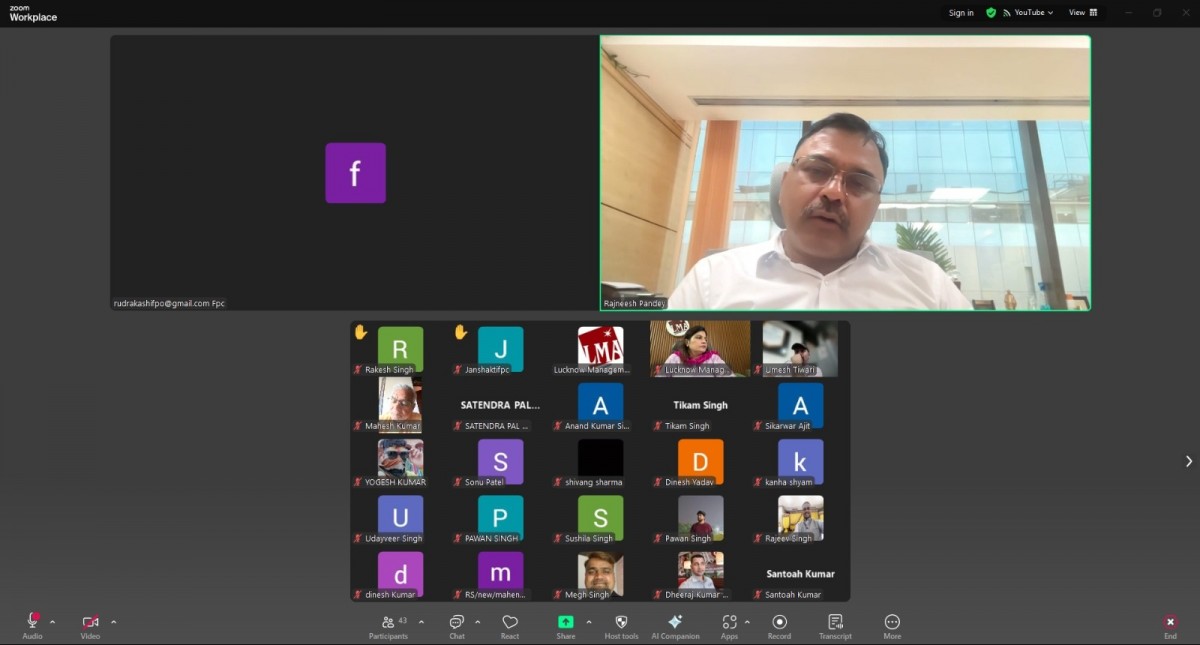 Lucknow Management Association organized an online workshop on “How to Tripling Farmers Income” on 13 August 2025. Speaker was Mr. Sudhanshu Kumar. Ms. Renu Chaudhary, General Manager LMA welcomed & introduced the Speaker and proposed a formal vote of Thanks on the occasion. More than 75 FPOs from Bareilly, Moradabad, Saharanpur and Meerut mandal were present in the online session.