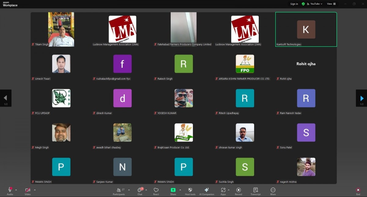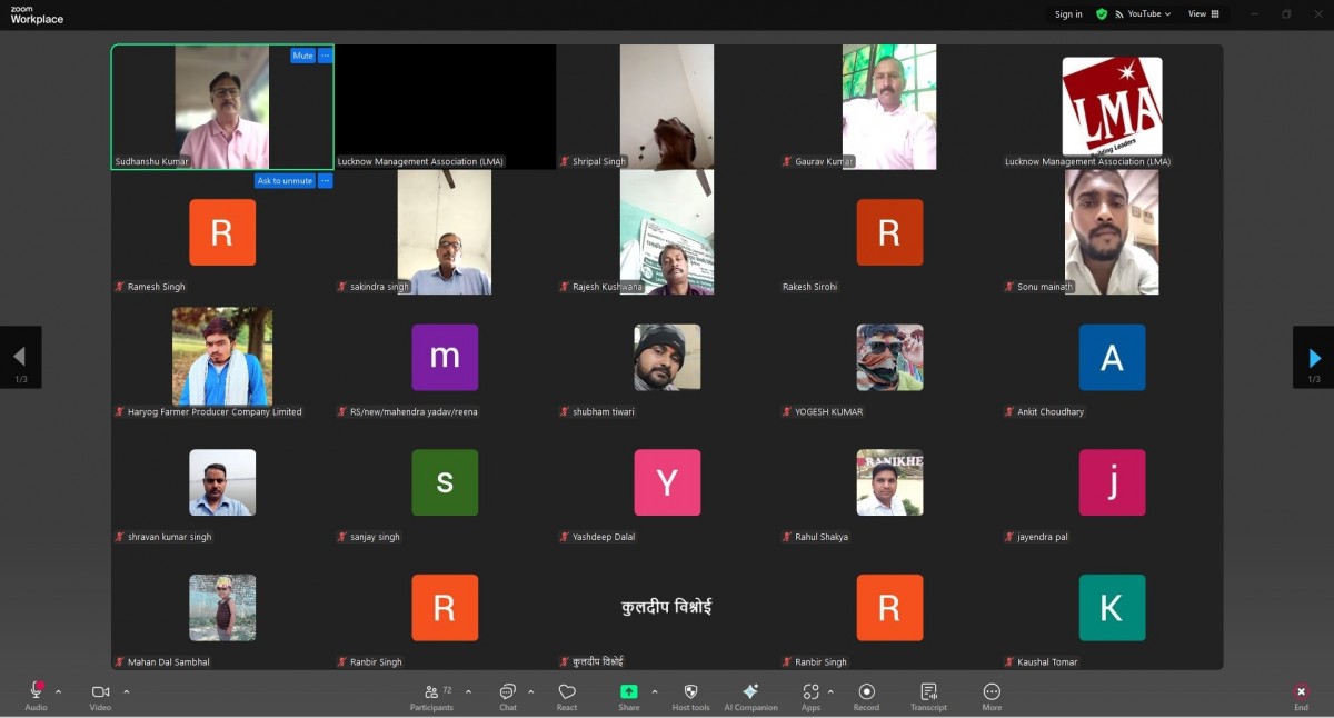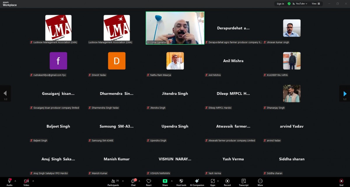 Lucknow Management Association organized an online workshop on “How to Tripling Farmers Income” on 26 August 2025. Speaker was Mr. Sudhanshu Kumar. Ms. Renu Chaudhary, General Manager LMA welcomed & introduced the Speaker and proposed a formal vote of Thanks on the occasion. More than 100 FPOs from Lucknow, Kanpur, Prayagraj and Basti mandal were present in the online session.