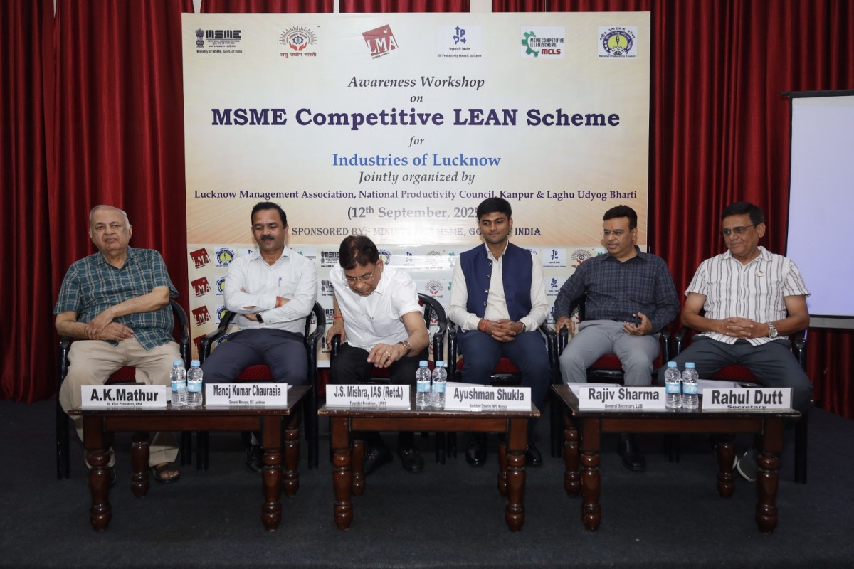 Lucknow Management Association in association with Laghu Udyog Bharti and the Department of MSME, GoUP organized an Awareness Workshop on “MSME Competitive LEAN Scheme for Manufacturing Units” on 12 September, 2025. Speaker was Mr. Ayushman Shukla Assistant Director, National Productivity Council (NPC). Many MSMEs were present in this workshop.