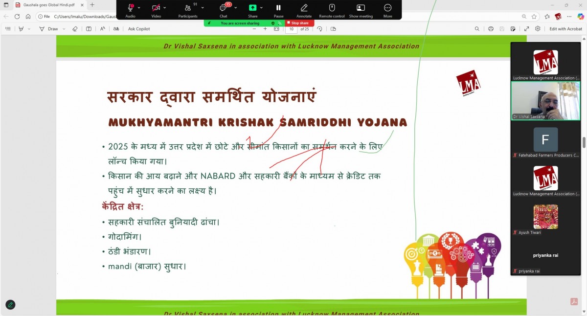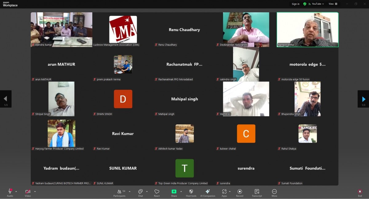 Lucknow Management Association organized an online workshop on “Resolving FPOs different problems” on 14 August 2025. Speaker was Dr. Ramesh Mittal Ex. Director NIAM. Ms. Renu Chaudhary, General Manager LMA welcomed & introduced the Speaker and proposed a formal vote of Thanks on the occasion. More than 55 FPOs from Bareilly, Moradabad, Saharanpur and Meerut mandal were present in the online session.