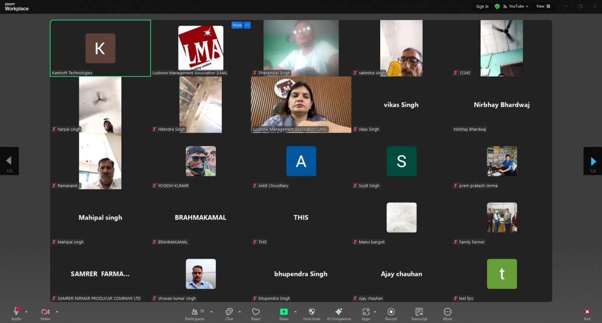 Lucknow Management Association organized an online workshop on “How to Tripling Farmers Income” on 05 September 2025. Speaker was Mr. Sudhanshu Kumar. Ms. Renu Chaudhary, General Manager LMA welcomed & introduced the Speaker and proposed a formal vote of Thanks on the occasion. More than 45 FPOs from Azamgarh, Gorakhpur, Faizabad, Devipatan and Chitrakoot mandal were present in the online session.