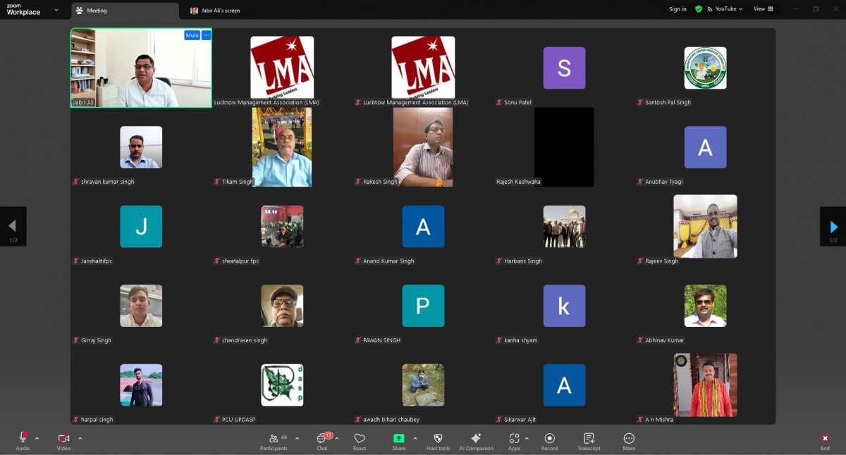 Lucknow Management Association organized an online workshop on “Effective Management of FPOs” on 22 August 2025. Speaker was Prof. Jabir Ali IIM Jammu. Ms. Renu Chaudhary, General Manager LMA welcomed & introduced the Speaker and proposed a formal vote of Thanks on the occasion. More than 45 FPOs from Bareilly, Moradabad, Saharanpur and Meerut mandal were present in the online session.