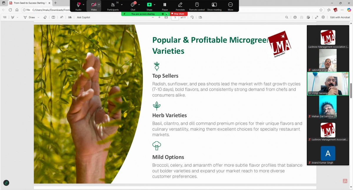 Lucknow Management Association organized an online workshop on “Microgreen Cultivation” on 04 September 2025. Speaker was Mr. Vishal Saxsena Consultant UAE. Ms. Renu Chaudhary, General Manager LMA welcomed & introduced the Speaker and proposed a formal vote of Thanks on the occasion. More than 30 FPOs from Lucknow, Kanpur, Prayagraj and Basti mandal were present in the online session.