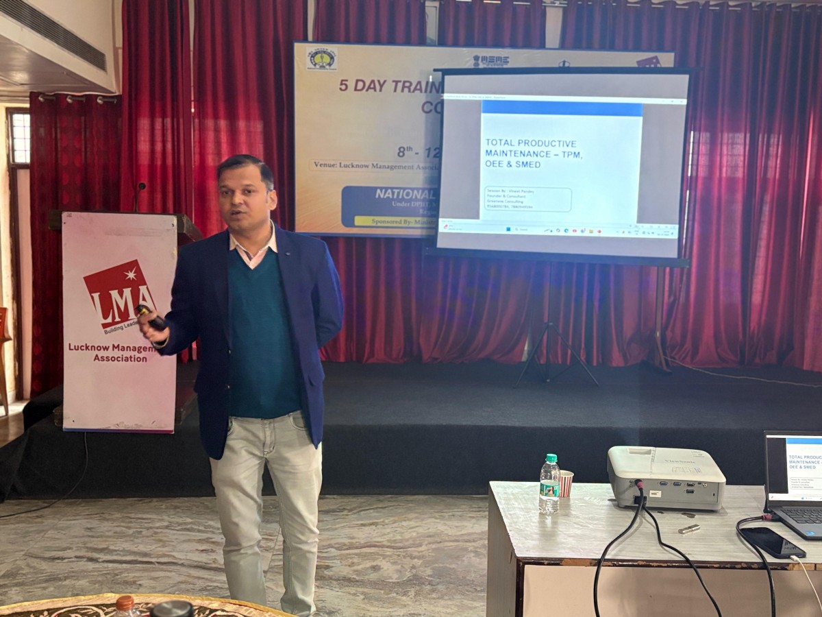 Lucknow Management Association (LMA), in collaboration with the National Productivity Council (NPC) and the Department of MSME, Government of India, successfully organized a five-day Consultant Training Programme under the MCLS/LEAN Scheme of the Ministry of MSME. On 09 Dec: Day 2, Mr. Vineet from NPC explained concepts such as Value Stream Mapping, work study, motion and time study, process capability, statistical tools, line balancing, and single-piece flow.