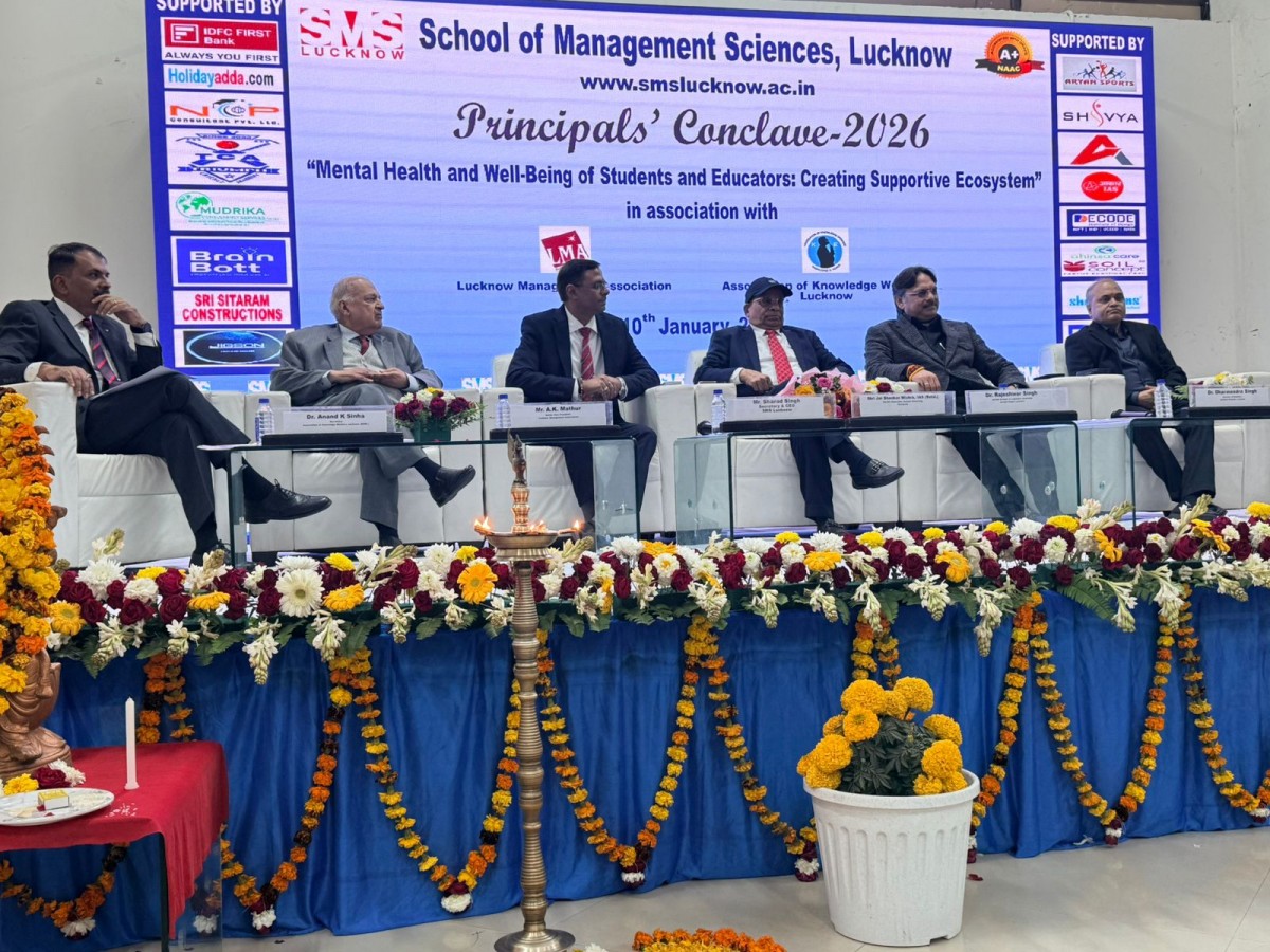 Lucknow Management Association in association with School of Management Sciences (SMS), Lucknow successfully organized the Principals’ Conclave–2026 on the theme “Mental Health and Well-being of Students and Educators: Creating a Supportive Ecosystem.” on 10 January, 2026. The conclave witnessed the participation of 200+ Principals from Lucknow and adjoining districts, reflecting a strong collective commitment to addressing mental health concerns in the education sector. Dr. Rajeshwar Singh, MLA, Sarojini Nagar, Lucknow, Session Chair & Keynote Speaker, emphasized that mental health is as vital as physical health and has emerged as one of the most critical challenges of contemporary society. Chief Guest Shri Jai Shankar Mishra, IAS (Retd.), Chancellor, Sushant University, Gurugram, expressed concern over the rapidly increasing mental health challenges faced by students. Guest of Honour Dr. Dharmendra Singh, Director (Orthopedics), Medanta Hospital, Lucknow, highlighted the importance of holistic health among learners. Shri Sharad Singh, Secretary & CEO, SMS Lucknow, reaffirmed the institution’s continuous focus on minimizing academic and teaching-related stress through workshops, seminars, interactive sessions, and competitions—ensuring a supportive, stress-free, and nurturing academic environment.