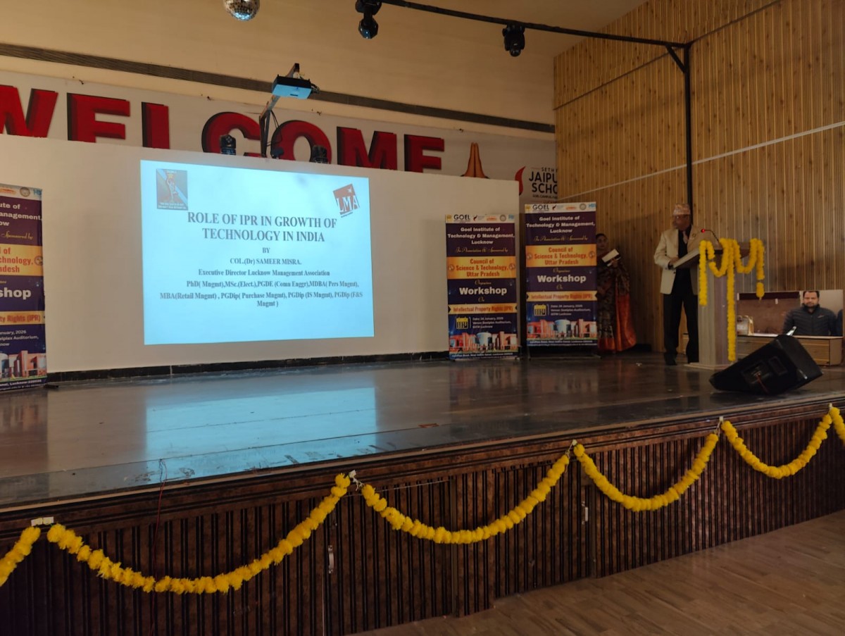 Lucknow Management Association in collaboration with Goel Institute of Technology & Management organized a workshop on "Role of IPR in Growth of Technology in India" by Col (Dr) Sameer Misra on 24 January 2026. Faculties and students of GITM were present.