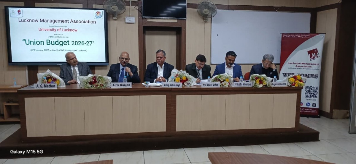 Lucknow Management Association organized a Panel Discussion on Union Budget 2026 on 06th February 2026. Eminent panelists were Mr. Rajata Mehra Director, Rajat Chemical Industry, Dr. Arvind Mohan Professor & Dean, University of Lucknow, and CA Jatin Srivastava Chartered Accountant. Mr. Alok Ranjan Former Chief Secretary GoUP was the session chair and Mr. Manoj Kumar Singh Former Chief Secretary GoUP and Chief Executive Officer State Transformation Commission GoUP was the co-session chair of the session. Mr. A.K. Mathur Sr. Vice President LMA welcomed & introduced the panelists and proposed a formal vote of Thanks at the end of the session.