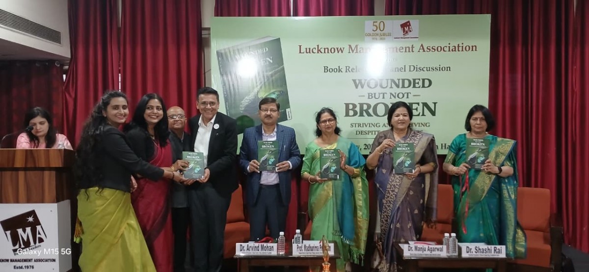 Lucknow Management Association organized a Panel Discussion and the launch of the book "Wounded But Not Broken", authored by Prof. Madhurima Pradhan, Dr. Naghma Javed and Dr. Pragya Singh on 21 February, 2026. Dr. Arvind Mohan, Professor of Economics & Dean, Faculty of Arts University of Lucknow was moderator of the session. Eminent panelists were Dr. Manju Agarwal, Director Centre of Excellence for Happiness Amity University Lucknow, Dr. Shashi Rai, Consultant Psychiatrist & Director Sambal Drug De-Addiction Centre and Prof. Madhurima Pradhan, Founder Director & Expert Happy Thinking Laboratory, University of Lucknow.